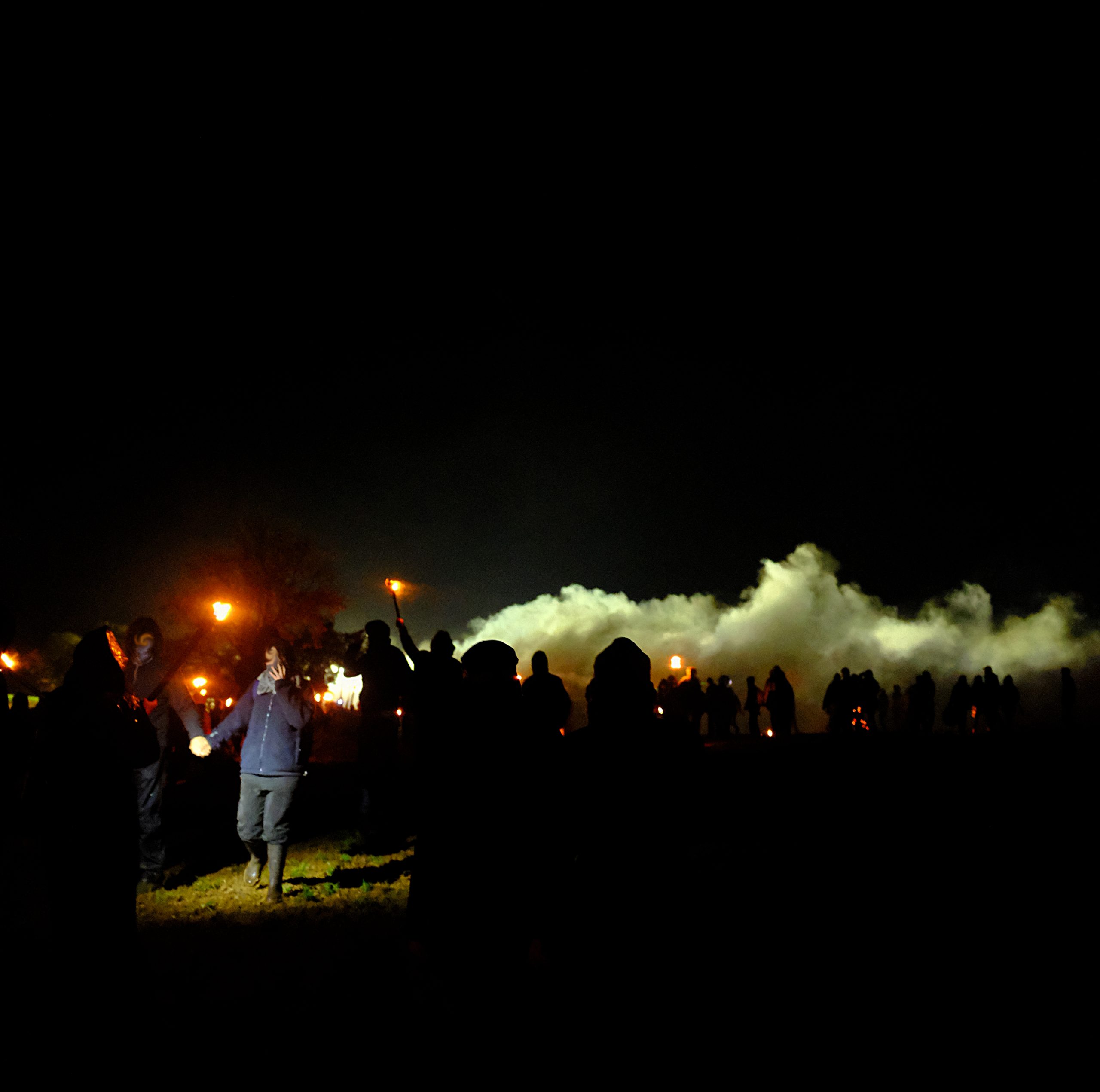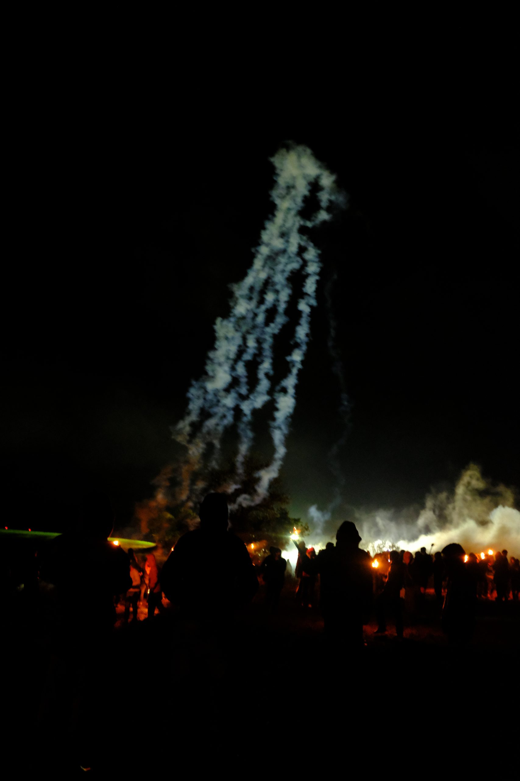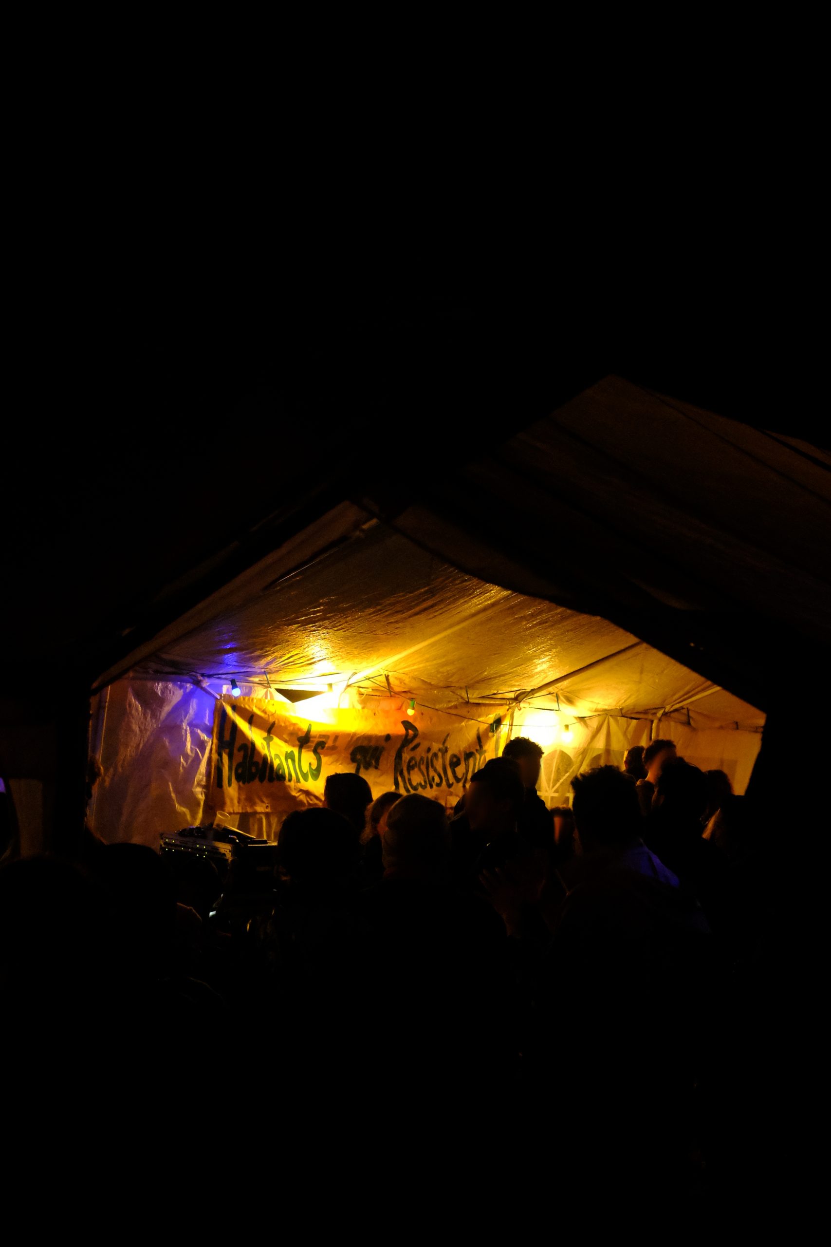 Le temps d’un week-end pluvieux dans la fange au début du mois de novembre, quelques centaines de personnes prêtèrent main forte aux courageux et courageuses pour essayer de reprendre cette plaine et, symboliquement, montrer qu’iels resteraient là, ne bougeraient pas et que rien ne les arrêterait. Pas même quelques molosses bleus casqués. Et ce soir là, dans un épais brouillard, une énergie chaude et victorieuse circulait dans ce cortège enflammé qui se dirigeait avec assurance vers les portes de la forteresse gardée. Des cris, des percussions, des rires. Des feux d’artifices. Et puis, bientôt, un officier paniqué au mégaphone, les troupes prenant place, “veuillez quitter la zone, s’il vous plait quittez la zone”, répété des dizaines de fois, atteignant la foule avec ironie, folle de cette énergie chaude, qui n’en avait que faire et criait plus fort. Entourée de feux-follets dansants, elle progressait vers des fumées plus ou moins colorées qui, dans des détonations différentes, provoquaient des cris de joie et des larmes sur ses visages émerveillés. Les sifflements menaçants des grenades lacrymogènes se confondaient avec les détonations joyeuses de nos feux d’artifice, faisant sursauter quelques épaules mais aucune peur ne se ressentait nulle part. La foule était portée par un sentiment de grandeur collective qui s’épanouissait à mesure que les grenades fusaient, marquant le ciel de leur trajectoire stupide qui ne faisait qu’arroser les champs voisins. Le vent qu’on essaye de nous voler était de notre côté. Jusqu’à ce que la terrible menace que représentaient nos flambeaux et nos cris ne deviennent trop inquiétante et qu’ils fassent pleuvoir des gazs par dizaines sur nos têtes et nos épaules, nous escortant sur tout le chemin jusqu’à quelques mètres à peine de chez nous. Charge après charge, ils ont fini par rétablir l’ordre des choses qui ne doit pas être changé, ici comme partout ailleurs. L’ordre public, celui qui ne doit être atteint, jamais. Celui qui, depuis 1995 et cet arrêt magnifiquement ironique et hypocrite du Conseil d’Etat, doit aussi comprendre le respect de la dignité humaine. Alors au nom du respect de la dignité humaine, ils font usage d’armes chimiques de guerre sur leurs propres citoyens. Sur des personnes qui luttent et se font du mal pour que le respect redevienne le respect, le vrai, surtout celui de la dignité humaine, et plus seulement un mot objet martelé à tout va par la politique politicienne qui broie le sens des mots comme elle broie tout le reste.