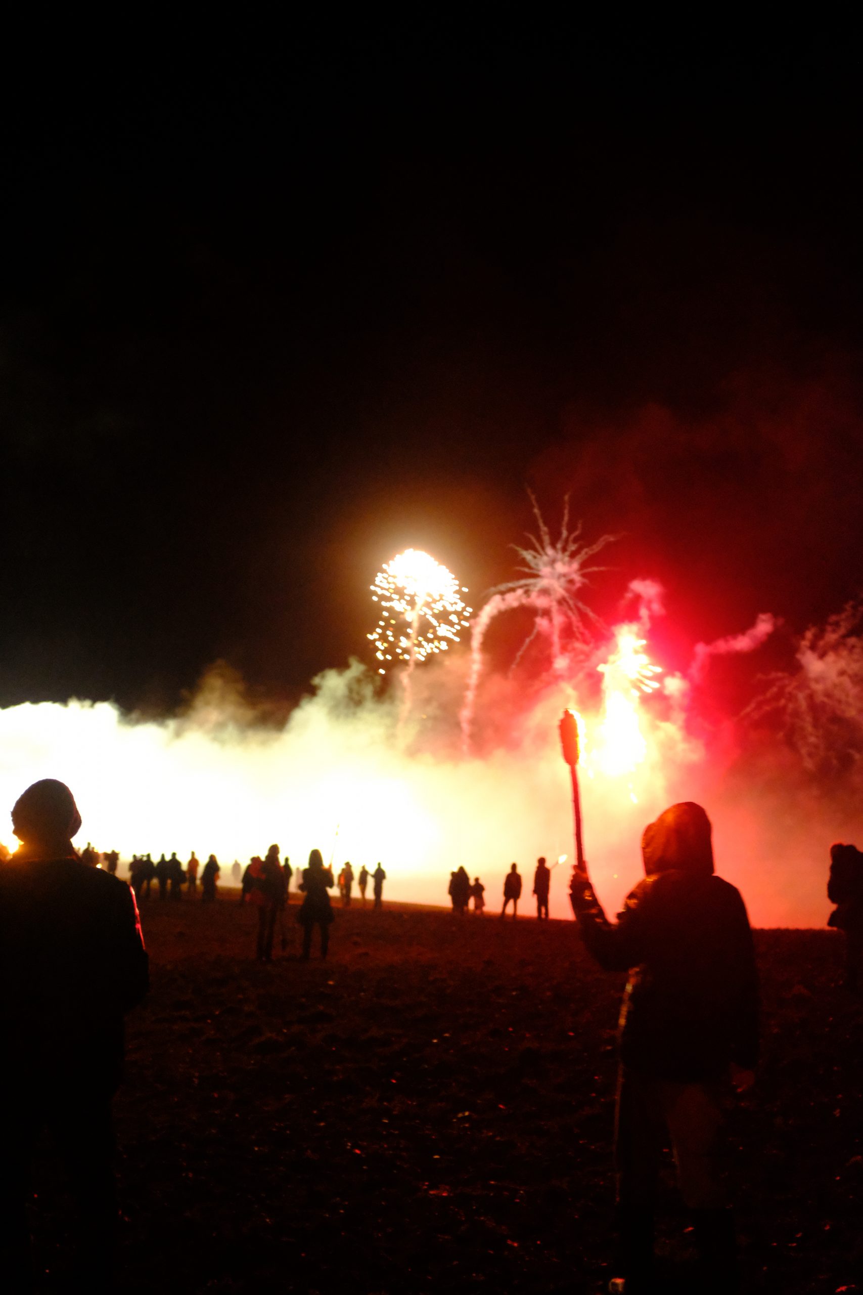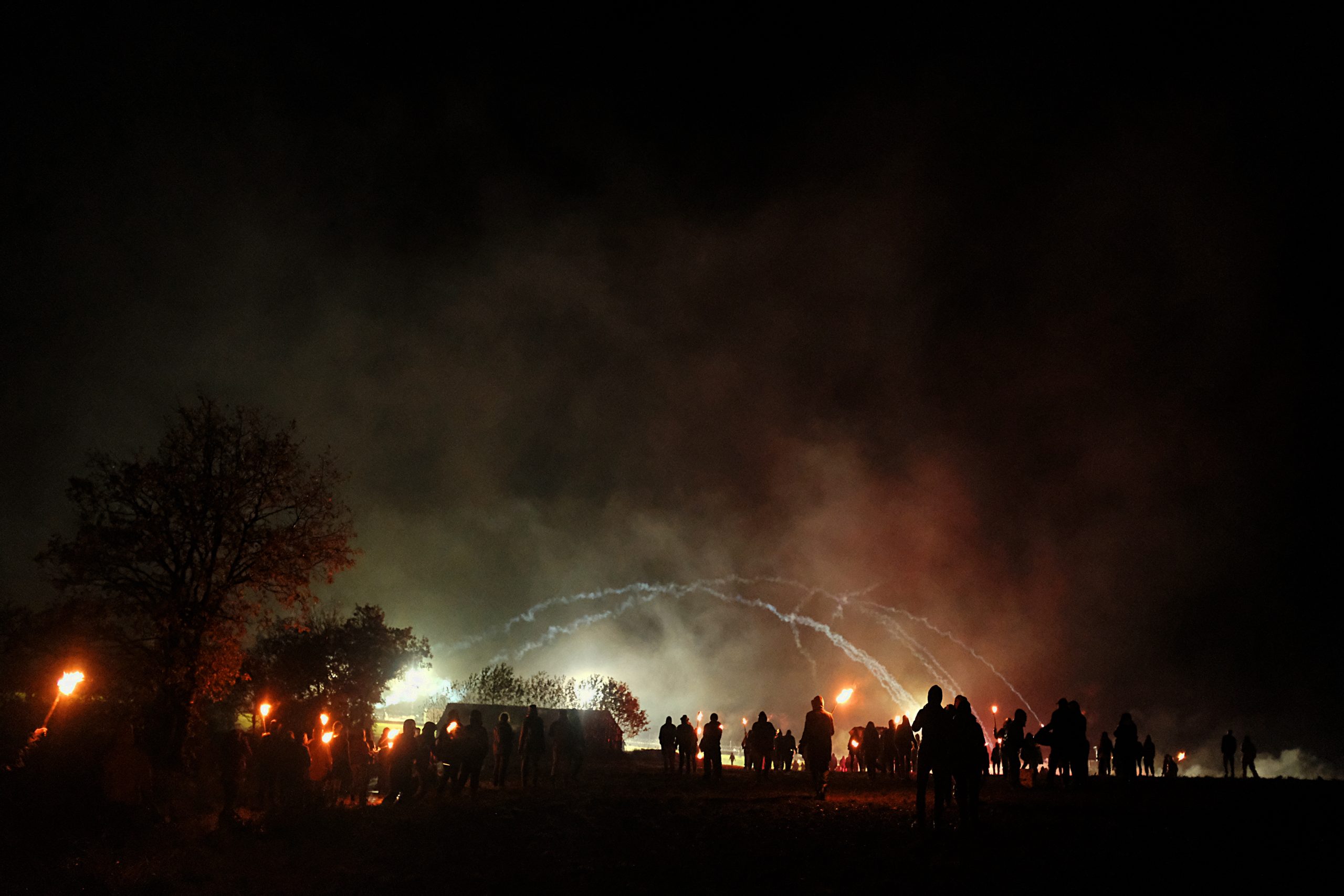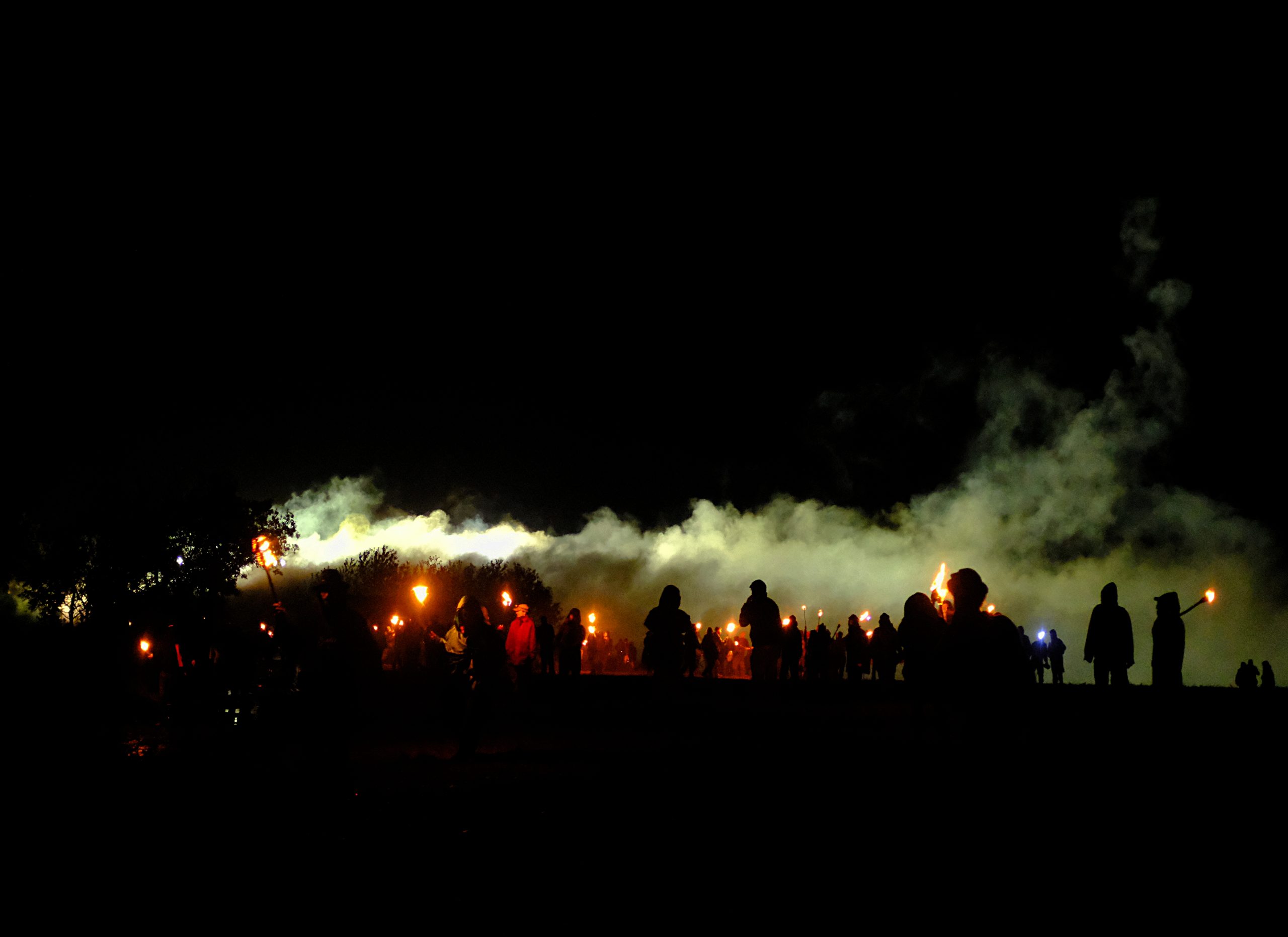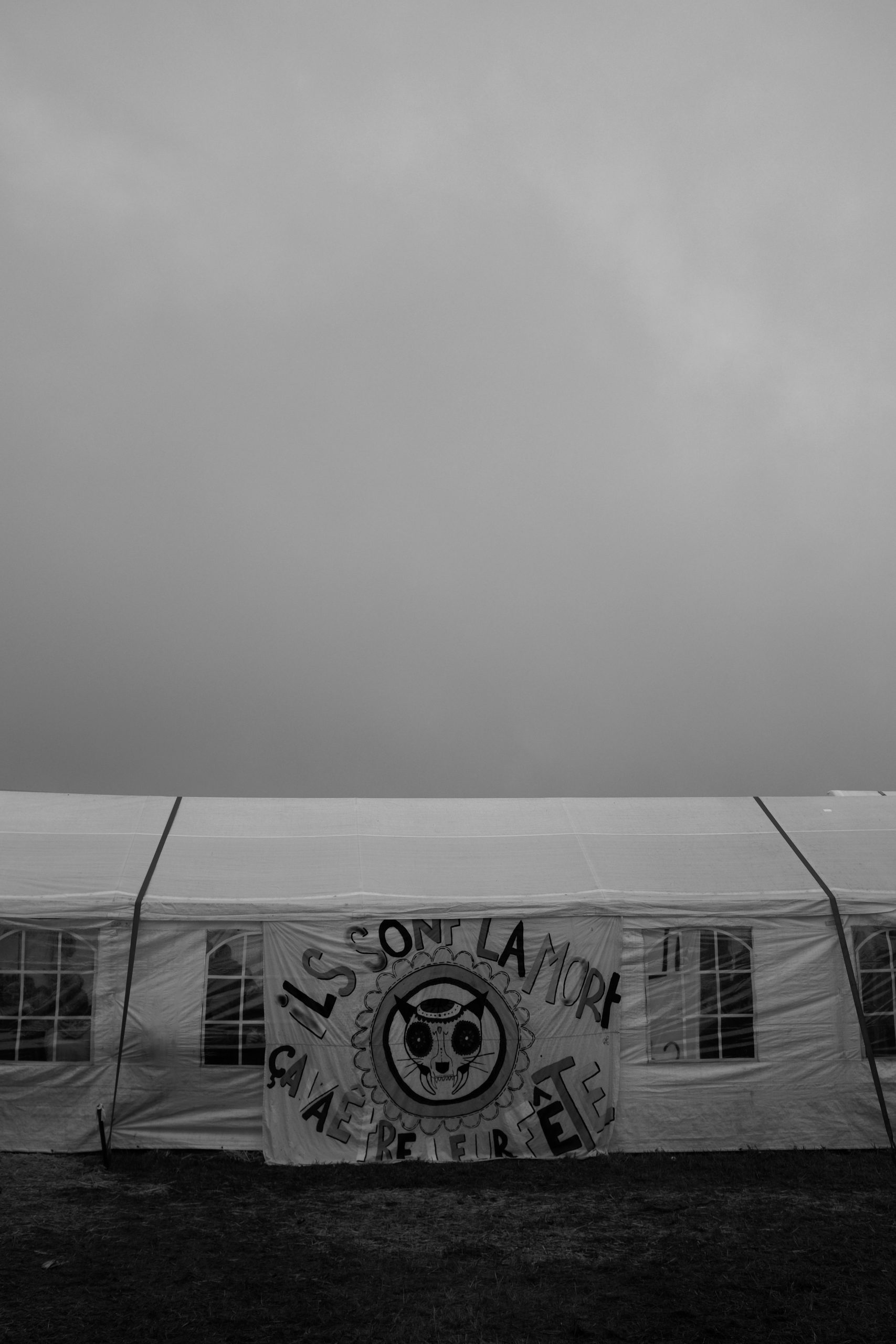 Le temps d’un week-end pluvieux dans la fange au début du mois de novembre, quelques centaines de personnes prêtèrent main forte aux courageux et courageuses pour essayer de reprendre cette plaine et, symboliquement, montrer qu’iels resteraient là, ne bougeraient pas et que rien ne les arrêterait. Pas même quelques molosses bleus casqués. Et ce soir là, dans un épais brouillard, une énergie chaude et victorieuse circulait dans ce cortège enflammé qui se dirigeait avec assurance vers les portes de la forteresse gardée. Des cris, des percussions, des rires. Des feux d’artifices. Et puis, bientôt, un officier paniqué au mégaphone, les troupes prenant place, “veuillez quitter la zone, s’il vous plait quittez la zone”, répété des dizaines de fois, atteignant la foule avec ironie, folle de cette énergie chaude, qui n’en avait que faire et criait plus fort. Entourée de feux-follets dansants, elle progressait vers des fumées plus ou moins colorées qui, dans des détonations différentes, provoquaient des cris de joie et des larmes sur ses visages émerveillés. Les sifflements menaçants des grenades lacrymogènes se confondaient avec les détonations joyeuses de nos feux d’artifice, faisant sursauter quelques épaules mais aucune peur ne se ressentait nulle part. La foule était portée par un sentiment de grandeur collective qui s’épanouissait à mesure que les grenades fusaient, marquant le ciel de leur trajectoire stupide qui ne faisait qu’arroser les champs voisins. Le vent qu’on essaye de nous voler était de notre côté. Jusqu’à ce que la terrible menace que représentaient nos flambeaux et nos cris ne deviennent trop inquiétante et qu’ils fassent pleuvoir des gazs par dizaines sur nos têtes et nos épaules, nous escortant sur tout le chemin jusqu’à quelques mètres à peine de chez nous. Charge après charge, ils ont fini par rétablir l’ordre des choses qui ne doit pas être changé, ici comme partout ailleurs. L’ordre public, celui qui ne doit être atteint, jamais. Celui qui, depuis 1995 et cet arrêt magnifiquement ironique et hypocrite du Conseil d’Etat, doit aussi comprendre le respect de la dignité humaine. Alors au nom du respect de la dignité humaine, ils font usage d’armes chimiques de guerre sur leurs propres citoyens. Sur des personnes qui luttent et se font du mal pour que le respect redevienne le respect, le vrai, surtout celui de la dignité humaine, et plus seulement un mot objet martelé à tout va par la politique politicienne qui broie le sens des mots comme elle broie tout le reste.