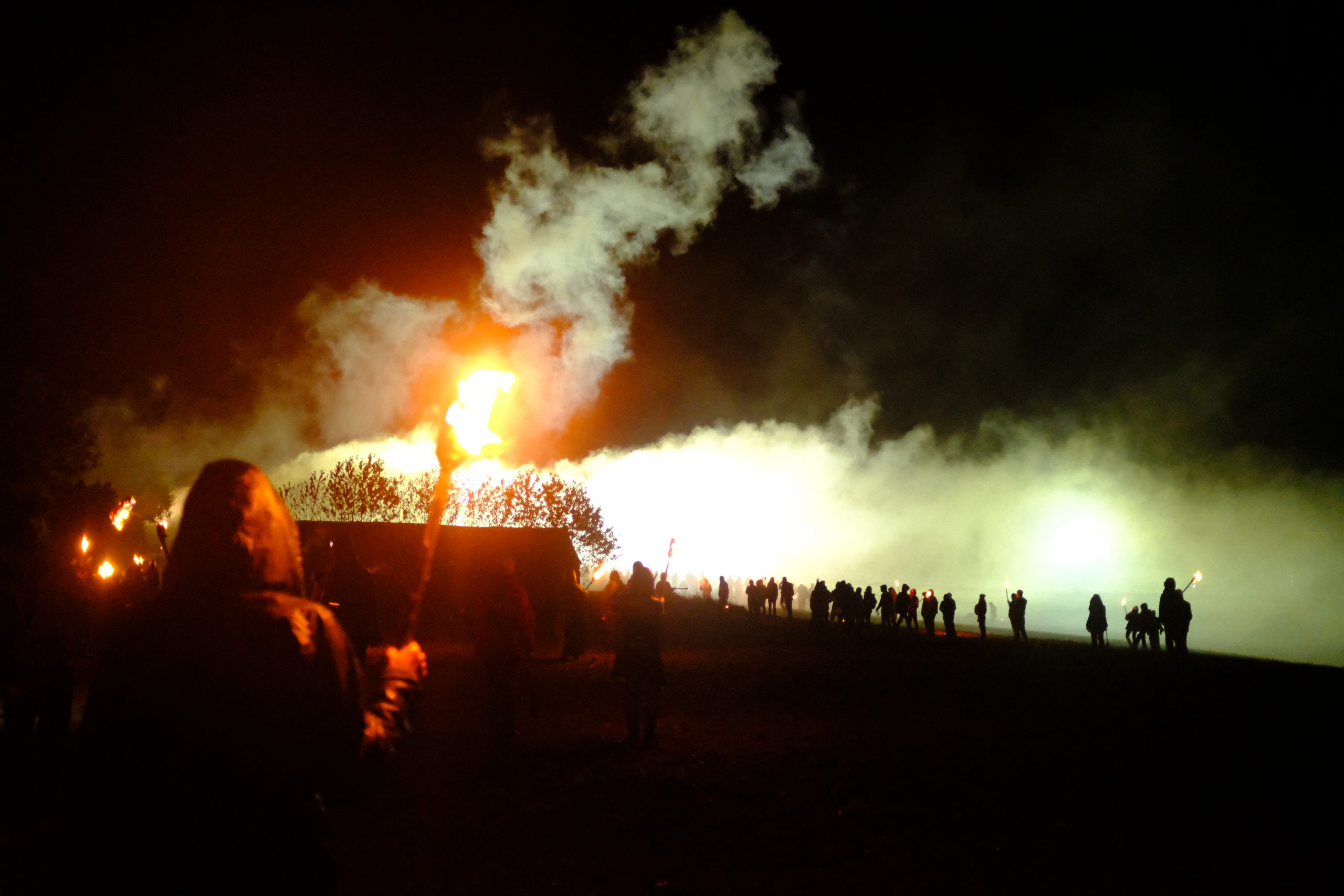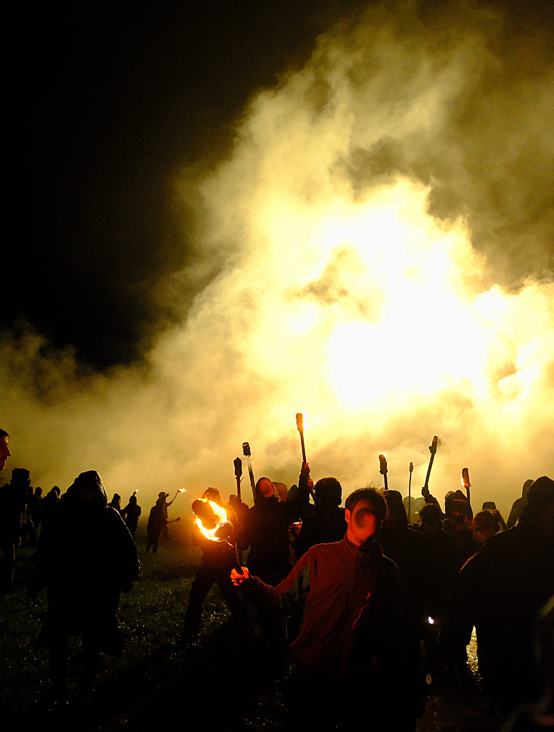 Cette histoire continue en haut d’une colline, au fond de l’Aveyron. Au rythme d’une batucada guerrière, une centaine de flambeaux avançaient dans un brouillard dégoulinant. Leur chaleur réchauffait nos visages fatigués et leur lumière nous guidait sur un chemin sombre et étroit, bientôt éclairé par un spot aussi agressif, intrusif et puissant que l’entité qui l’a installé, l’entité qui représente ces autres – eux qui nous écrasent et écrasent la nature au nom d’une transition écologique quelconque qui n’est autre que la nouvelle combine de notre monde pour engraisser ses entreprises et leurs actionnaires suidés. Un accueil éblouissant, froid et brutal pour ceux qui, deux mois auparavant, vivaient ensemble sur cette plaine et œuvraient à construire un autre monde, beau et juste. Maintenant elle est bien gardée par de gros chiens bleus un peu robotiques, vous savez, ceux que Pétain a oubliés. Ils protègent l’embryon du chantier d’un méga-transformateur qui est une autre preuve que notre système est un système qui marche à fond les ballons vers sa fin. Et qui écrase tout en passant. Cette plaine, c’est un de ces endroits qui sont sacrifiés au nom du profit et du confort de certains gros cochons qui mangent trop et trop vite. Ici les gros cochons sont RTE et EDF.